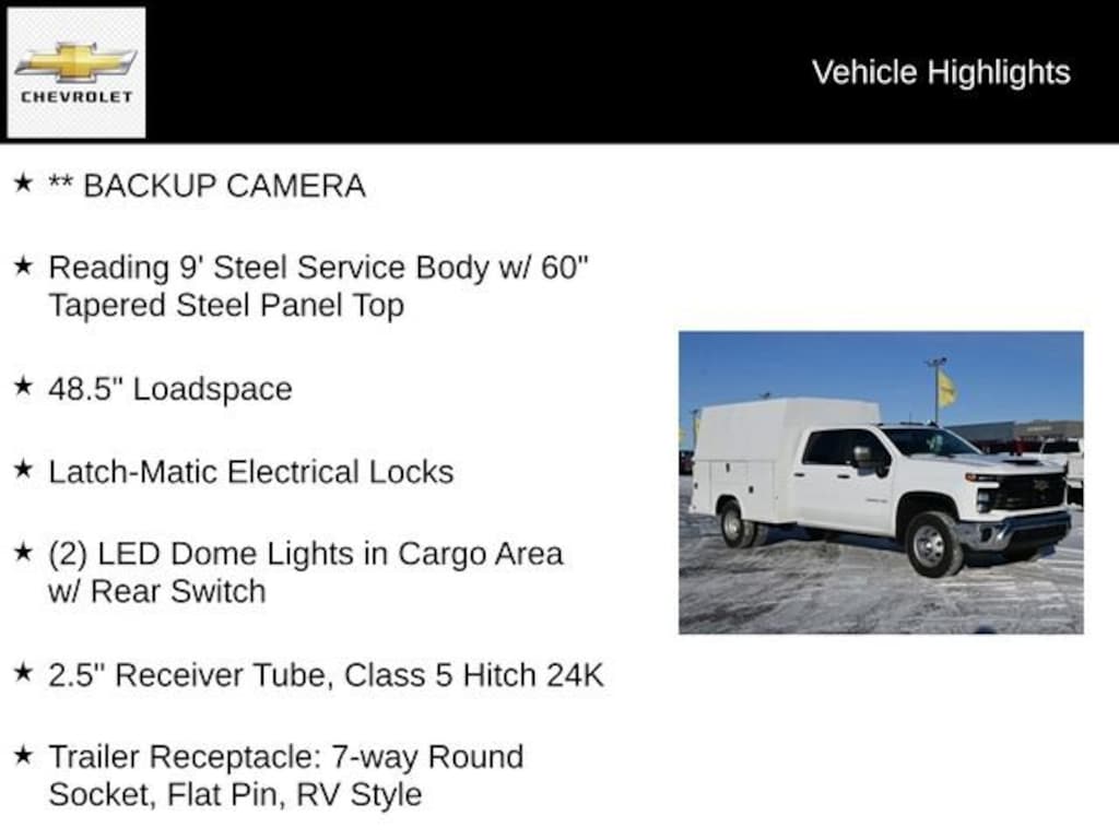 ** BACKUP CAMERA, Reading 9' Steel Service Body w/ 60 Tapered Steel Panel Top, 48.5 Loadspace, Latch-Matic Electrical Locks, (2) LED Dome Lights in Cargo Area w/ Rear Switch, 2.5 Receiver Tube, Class 5 Hitch 24K, Trailer Receptacle: 7-way Round Socket, Flat Pin, RV Style, 10-Speed Automatic, 4WD, Jet Black Vinyl.